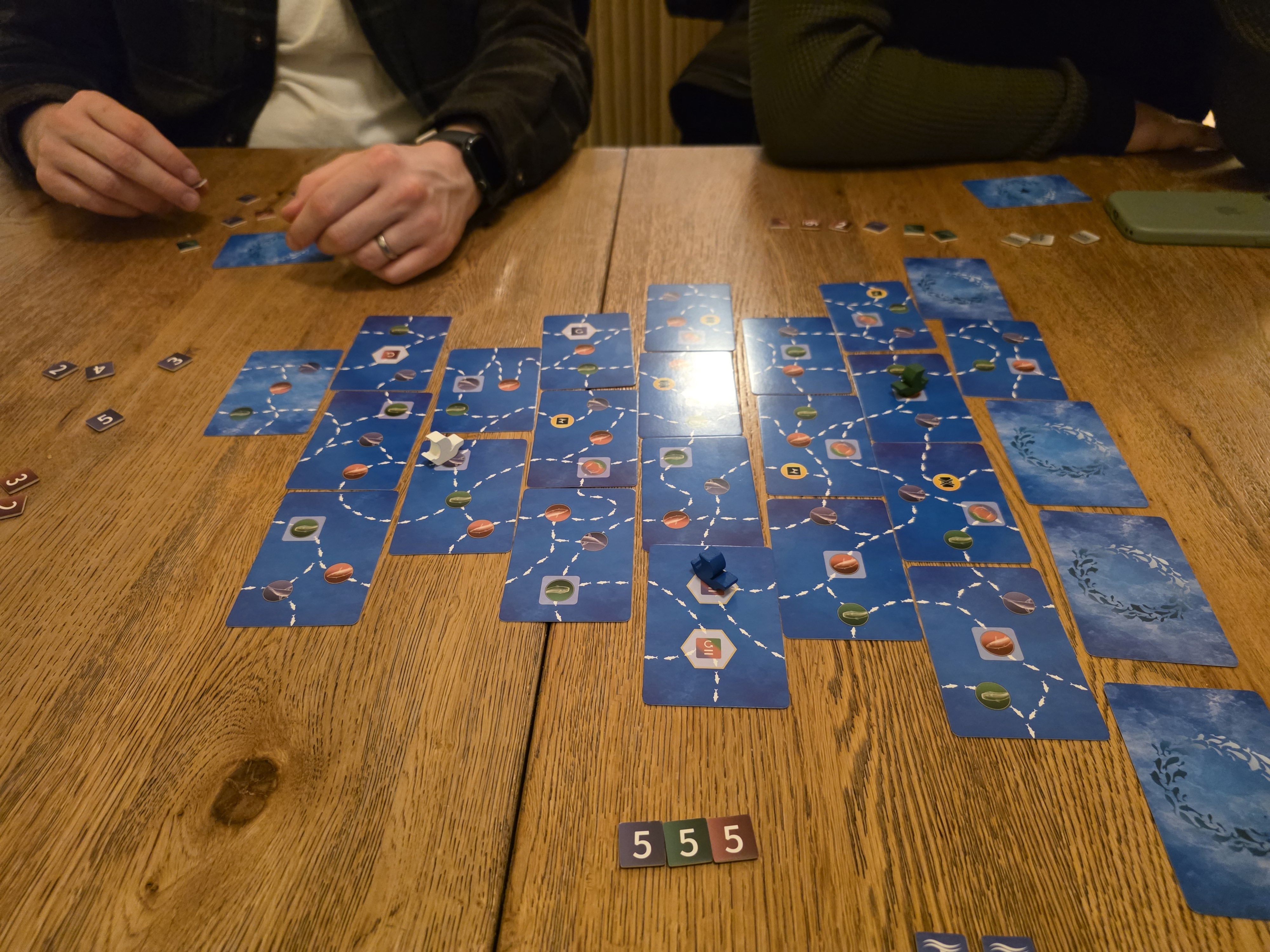 A pickup and deliver game where you are fishing ships, collect and selling fish. You expand the map by place a new card and then move your ship between space places on the cards. You have to balance collecting fish for sets and selling some for point. Was a mildly diverting little game, wouldn't jump or play again but wouldn't say no either.